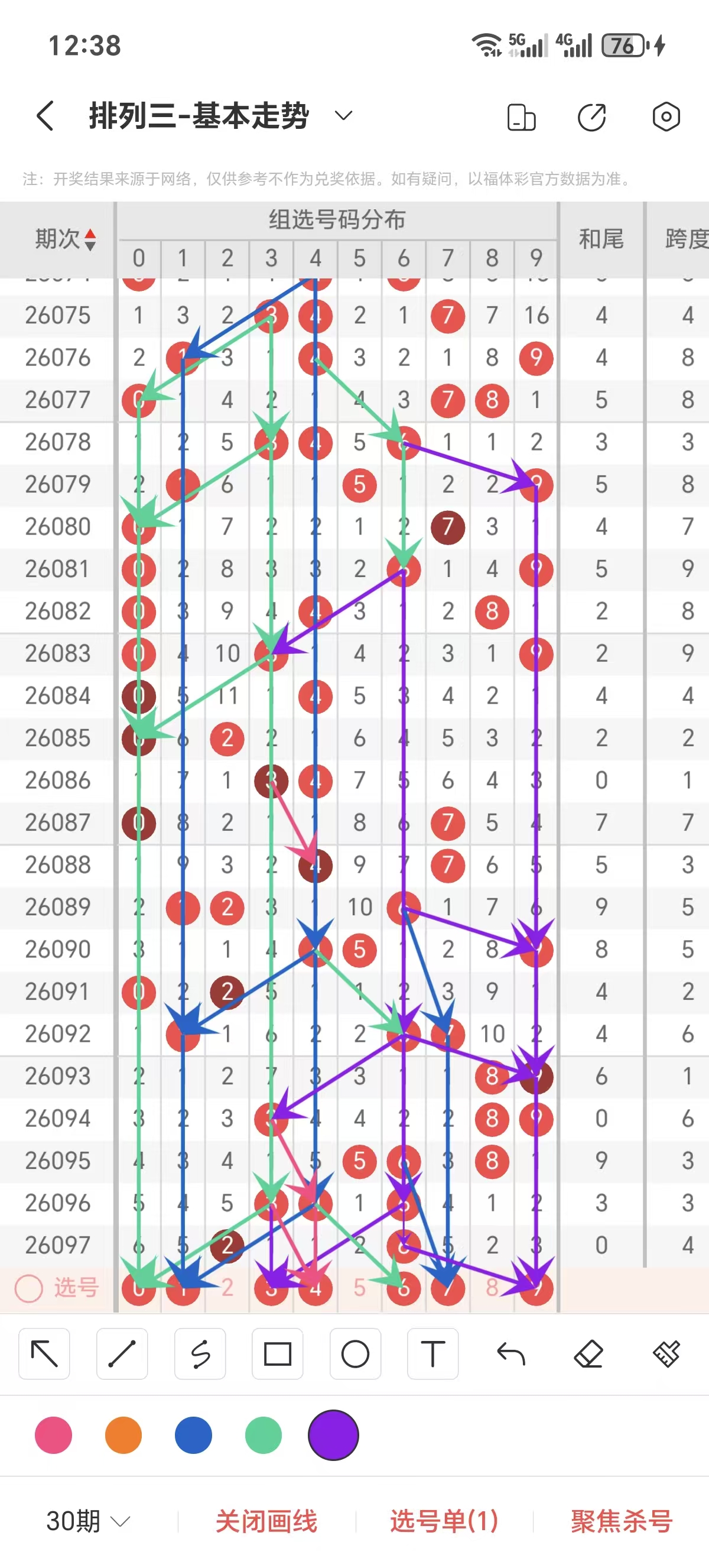 通常情况下在五期之内重复一个跨度的概率较高,近五期重复了3/6的跨度,近五期跨度为1/6/3/3/4,近期01路的跨度较热,本期要侧重3/5/8跨为主的号码组合。选择好跨度就可以从跨度方面选择相应的双胆码组合,双胆码的选取要根据近期和历史的走势进一步的分析选取。