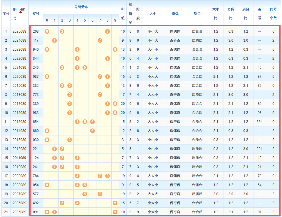 1、统计往年同期开奖号码