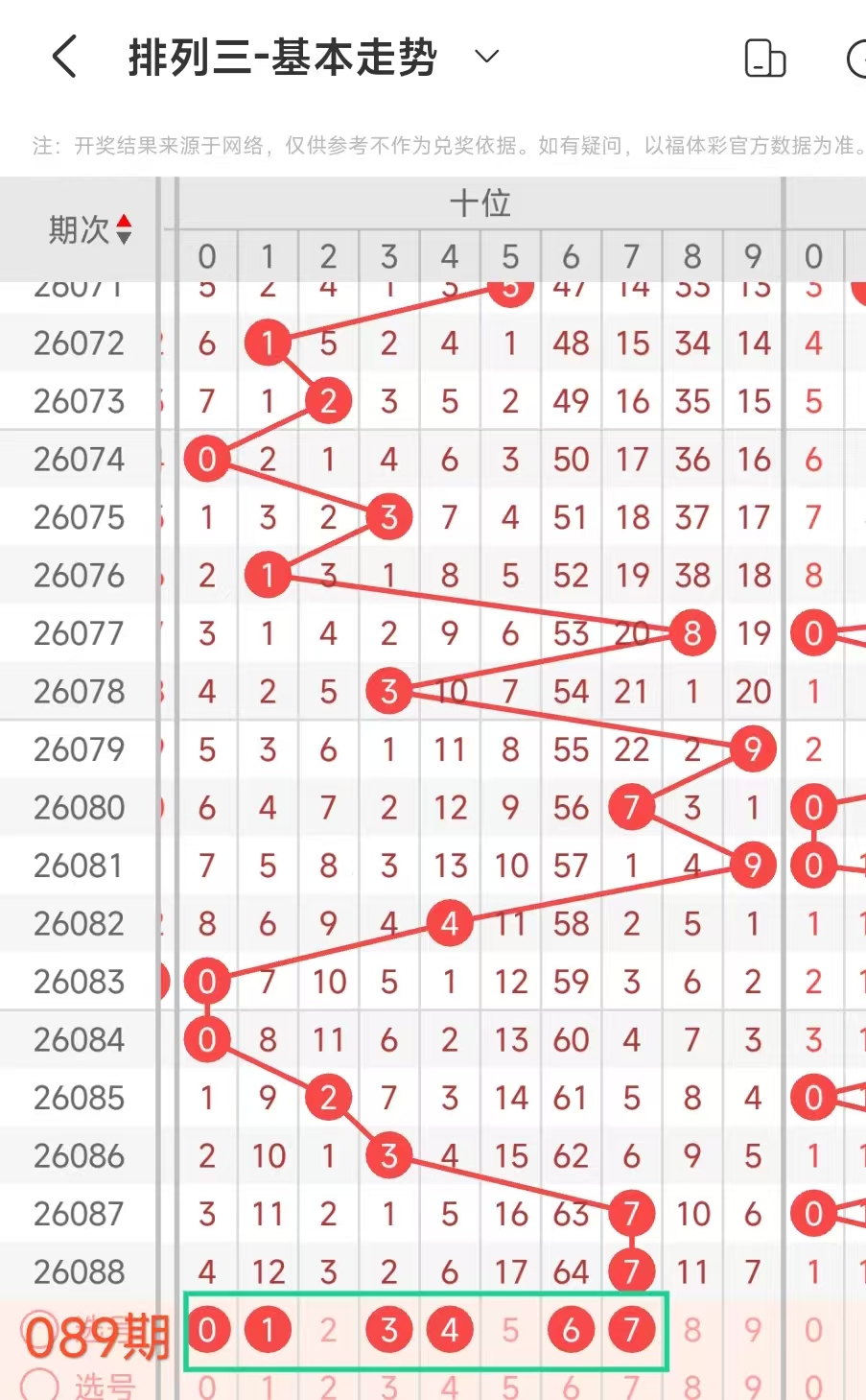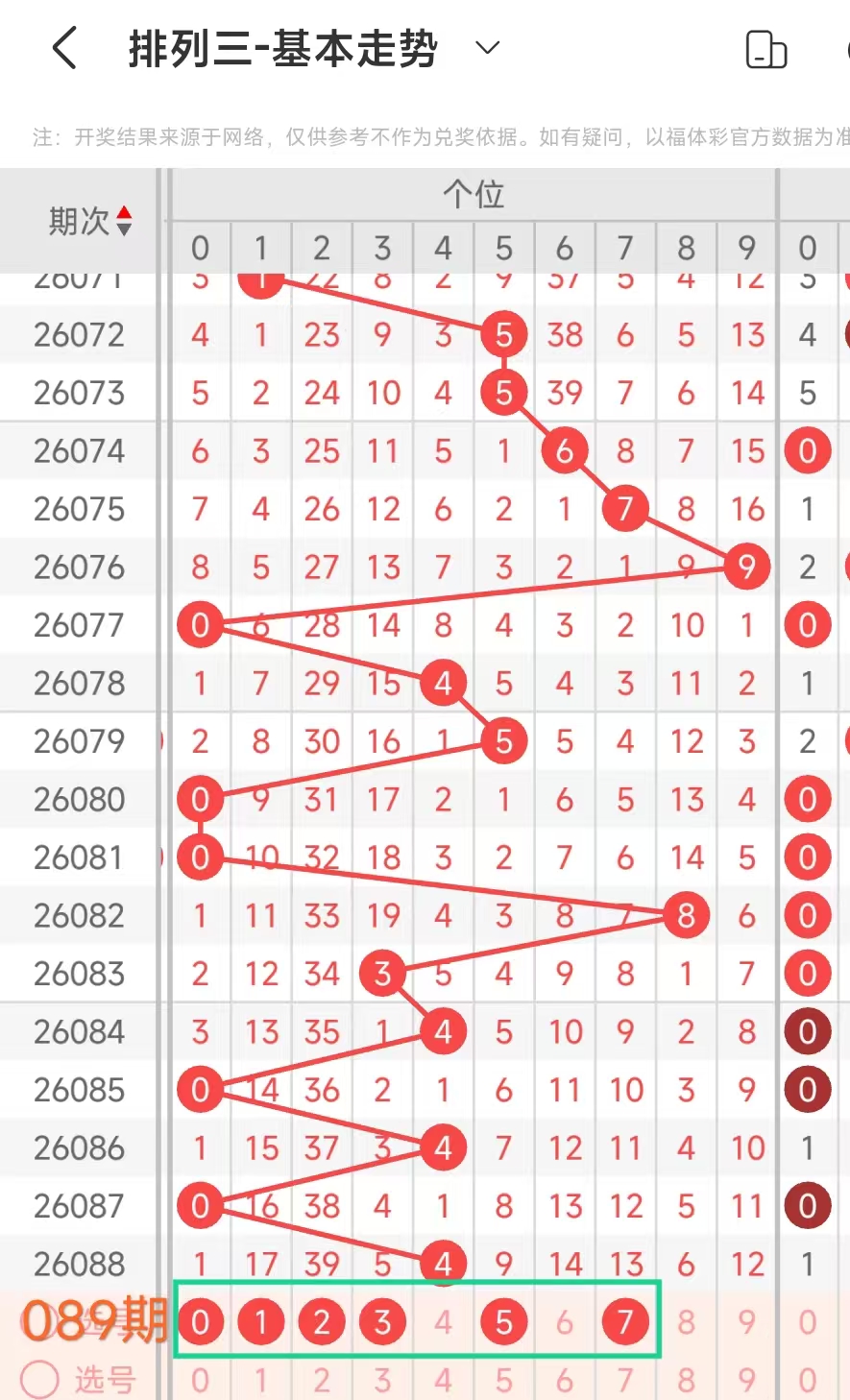 经统计0号出现7次、1号出现5次、2号出现7次、3号出现5次、4号出现9次、5号出4次、6号出现2次、7号出5次、8号出现7次、9号出现5次.统计后出现次数靠前的数字作为我们的备选号码.其号码有0248等