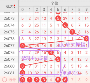 近7期(075~081)开奖号个位号码球分别为7、9、0、4、5、0、0,开奖号与上一期走出的振幅分别为1、2、9、4、1、5、0。075期走出7号大数号码球,走出“1”的小幅度,076期走出9号大数号码球,走出“2”的小幅度,077期走出0号小数号码球,走出“9”的大幅度,078期走出4号中小数号码球,走出“4”的中小幅度,079期走出5号中大数号码球,走出“1”的中幅度,080期走出0号小数号码球,走出“5”的中大幅度,081期走出0号小数号码球,走出“0”的小幅度;从近期振幅大小的走势及大小走势来看,中大振幅走在5~6之间较为适宜,中小振幅走在0~3之间较为适宜;结合走势图的整体及大小走势分析,本期个位应重点关注号码球为0、1、2、3、5、6。