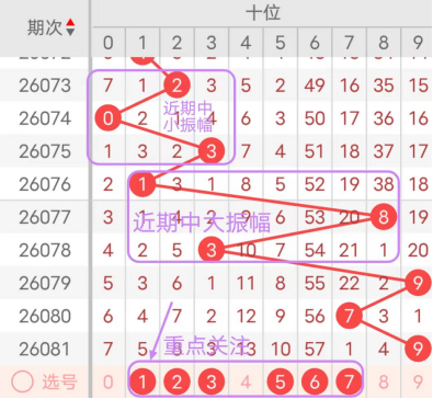 近7期(075~081)开奖号十位号码球分别为3、1、8、3、9、7、9,开奖号与上一期走出的振幅分别为3、2、7、5、6、2、2。075期走出3号中小数号码球,走出“3”的中小幅度,076期走出1号小数号码球,走出“2”的小幅度,077期走出8号大数号码球,走出“7”的大幅度,078期走出3号中小数号码球,走出“5”的中大幅度,079期走出9号大数号码球,走出“6”的中大幅度,080期走出7号大数号码球,走出“2”的小幅度,081期走出9号大数号码球,走出“2”的小幅度;从振幅大小及走势图的整体对应来看,中大振幅走在6~8之间较为适宜,中小振幅走在2~4之间较为适宜;结合走势图的上下对应及振幅大小分析,本期十位应重点关注号码球为1、2、3、5、6、7。