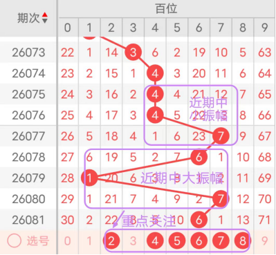 近7期(075~081)开奖号百位号码球分别为4、4、7、6、1、7、6,开奖号与上一期走出的振幅分别为0、0、3、1、5、6、1。075期走出4号中小数号码球,走出“0”的小幅度,076期走出4号中小数号码球,走出“0”的小幅度,077期走出7号大数号码球,走出“3”的中小幅度,078期走出6号中大数号码球,走出“1”的小幅度,079期走出1号小数号码球,走出“5”的中大幅度,080期走出7号大数号码球,走出“6”的中大幅度,081期走出6号中大数号码球,走出“1”的小幅度;从振幅大小及走势图的整体形势来看,中大幅度走在3~4之间较为适宜,中小幅度走在0~2之间较为适宜;结合走势图的整体及大小走势分析,本期百位需重点关注号码球为2、4、5、6、7、8。