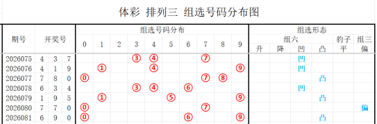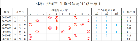近7期(075~081)开奖号与012路组合分别为437(011)、419(011)、780(012)、634(001)、195(012)、770(011)、690(000),上期开奖号为000路组合,根据整体走势分析,本期看好的012路组合有:002、012、022,防001、011、222路组合。