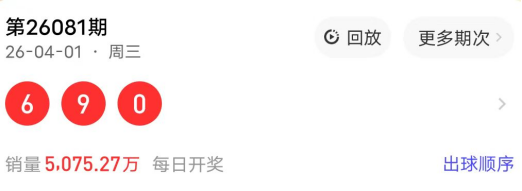 2026081期开奖号码为690,奇偶值为1奇2偶;大小值为2大1小;012路走势为000路;跨度为9跨;和值15点;组六形态。