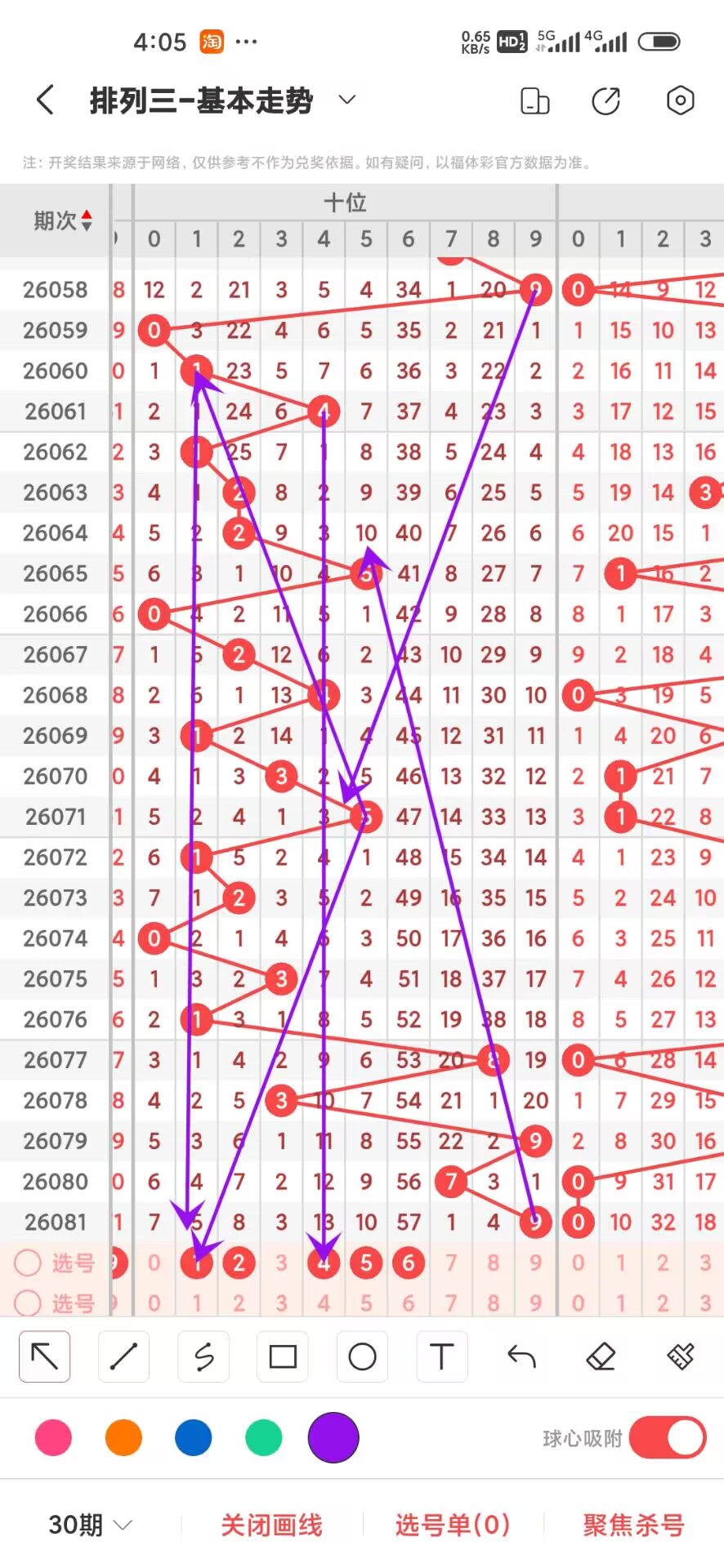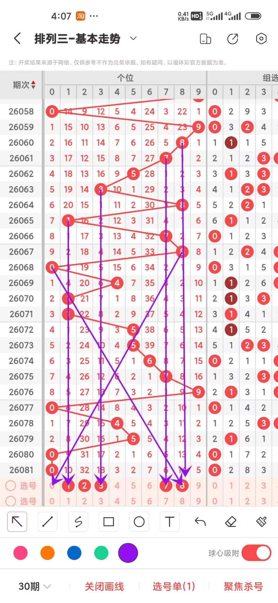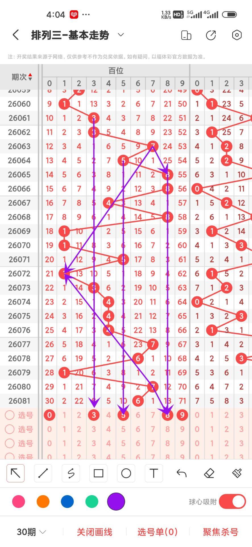 2026082期,上期百位开出偶数6,我们通过走势图来看300期012路中下号的数据,0路号码的最大总数是101次,0369分别在300期内下号分别是27,21,32,21,这几个数之间6下号最多,我们再来看1路号码最大总数是101,147号码分别是,38,27,36,这三者之间4下号最少,再回过头来看2路号最大总数是98次,258号码分别是35,29,34次,这三个数之间差别不大,通过上面的分析百位目前大号继续下号我们可以关注下,我们可以看出目前百位0路号码开始回补,02598号码走势就有点冷淡,今天百位我们重点关注03589,具体看下面走势图