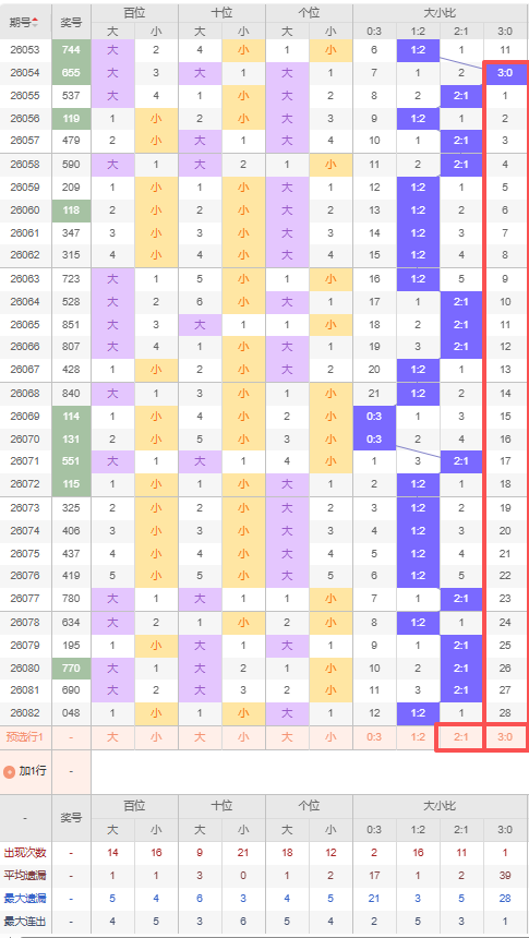 上期奇偶比:0:3,近10期奇偶比出现情况:2:1、0:3、2:1、2:1、1:2、1:2、3:0、2:1、1:2、0:3,最近10期出现4期2:1,出现3期1:2,出现2期0:3,出现1期3:0,根据近10期出号规律本期遗漏2期的2:1,防隔期出1:2,综上所述奇偶比推荐:1:2,重点关注:2:1。