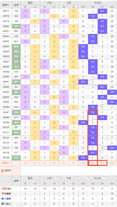 上期大小比:0:3,近10期大小比出现情况:1:2、2:1、0:3、1:2、1:2、1:2、1:2、3:0、1:2、0:3,最近180期出1期2:1,出现6期1:2,出现2期0:3,出现1期3:0,根据近10期出号规律本期推荐遗漏8期的2:1,防隔期出1:2,综上所述大小比推荐:1:2,重点关注:2:1。