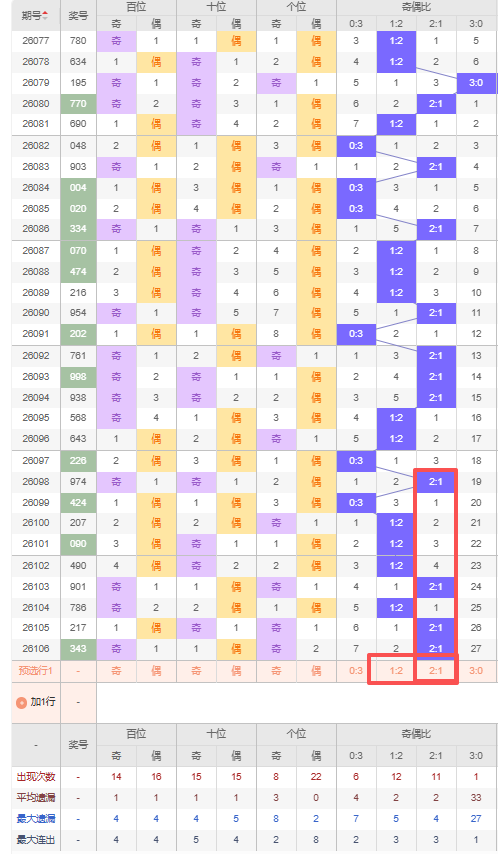上期奇偶比:2:1,近10期奇偶比出现情况:2:1、0:3、1:2、1:2、1:2、2:1、2:1、1:2、2:1、2:1,最近10期出现5期2:1,出现4期1:2,出现1期0:3,出现0期3:0,根据近10期出号规律本期推荐三连出2:1,防遗漏2期出1:2,综上所述奇偶比推荐:1:2,重点关注:2:1。