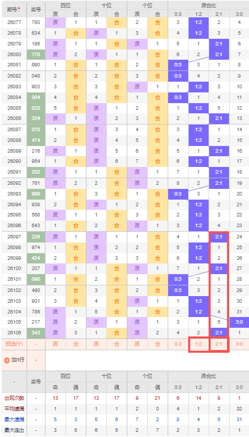 上期质合比:2:1,近10期质合比出现情况:2:1、1:2、1:2、2:1、0:3、0:3、1:2、1:2、3:0、2:1,最近10期出现3期2:1,出现4期1:2,出现2期0:3,出现1期3:0,根据近10期规律本期推荐连出的2:1,防遗漏2期出1:2,综上所述质合比推荐:1:2,重点关注:2:1。