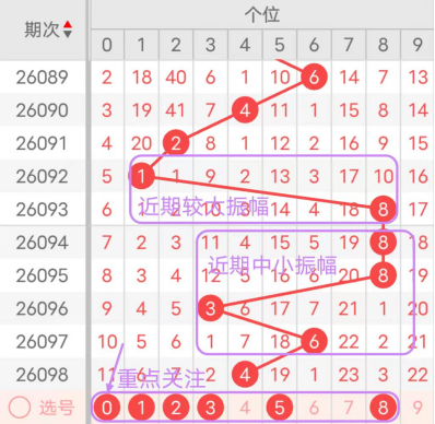 近7期(092~098)开奖号个位号码球分别为1、8、8、8、3、6、4,开奖号与上一期走出的振幅分别为1、7、0、0、5、3、2。092期走出1号小数号码球,走出“1”的小幅度,093期走出8号大数号码球,走出“7”的大幅度,094期走出8号大数号码球,走出“0”的小幅度,095期走出8号大数号码球,走出“0”的小幅度,096期走出3号中小数号码球,走出“5”的中大幅度,097期走出6号中大数号码球,走出“3”的中小幅度,098期走出4号中小数号码球,走出“2”的小幅度;从近期振幅大小的走势及大小走势来看,中大振幅走在3~4之间较为适宜,中小振幅走在1~5之间较为适宜;结合走势图的整体及大小走势分析,本期个位应重点关注号码球为0、1、2、3、5、8。