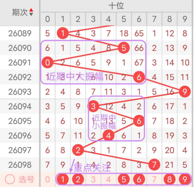 近7期(092~098)开奖号十位号码球分别为6、9、3、6、4、2、7,开奖号与上一期走出的振幅分别为6、3、6、3、2、2、5。092期走出6号中大数号码球,走出“6”的中大幅度,093期走出9号大数号码球,走出“3”的中小幅度,094期走出3号中小数号码球,走出“6”的中大幅度,095期走出6号中大数号码球,走出“3”的中小幅度,096期走出4号中小数号码球,走出“2”的小幅度,097期走出2号小数号码球,走出“2”的小幅度,098期走出7号大数号码球,走出“5”的中大幅度;从振幅大小及走势图的整体对应来看,中大振幅走在5~6之间较为适宜,中小振幅走在1~2之间较为适宜;结合走势图的上下对应及振幅大小分析,本期十位应重点关注号码球为1、2、5、6、8、9。