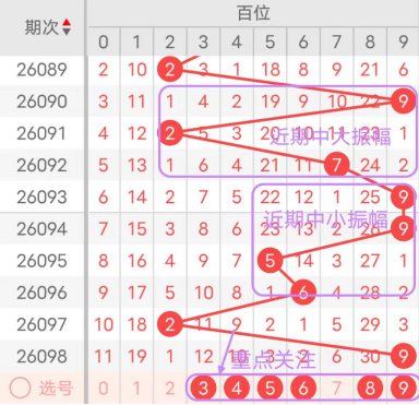 近7期(092~098)开奖号百位号码球分别为7、9、9、5、6、2、9,开奖号与上一期走出的振幅分别为5、2、0、4、1、4、7。092期走出7号大数号码球,走出“5”的中大幅度,093期走出9号大数号码球,走出“2”的小幅度,094期走出9号大数号码球,走出“0”的小幅度,095期走出5号中大数号码球,走出“4”的中小幅度,096期走出6号中大数号码球,走出“1”的小幅度,097期走出9号大数号码球,走出“7”的大幅度,098期走出9号大数号码球,走出“7”的大幅度;从振幅大小及走势图的整体形势来看,中大幅度走在4~6之间较为适宜,中小幅度走在0~3之间较为适宜;结合走势图的整体及大小走势分析,本期百位需重点关注号码球为3、4、5、6、8、9。