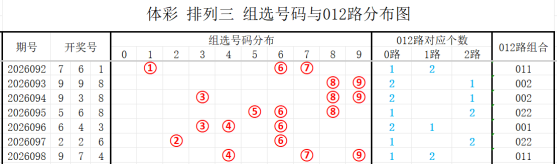 近7期(092~098)开奖号与012路组合分别为761(011)、998(002)、938(002)、568(022)、643(001)、226(022)、974(011),上期开奖号为011路组合,根据整体走势分析,本期看好的012路组合有:012、001、011,防122、022、002路组合。
