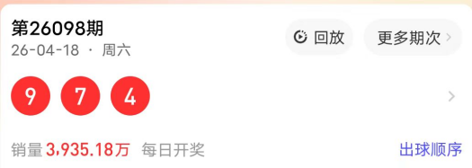 2026098期开奖号码为974,奇偶值为2奇1偶;大小值为2大1小;012路走势为011路;跨度为5跨;和值20点;组六形态。
