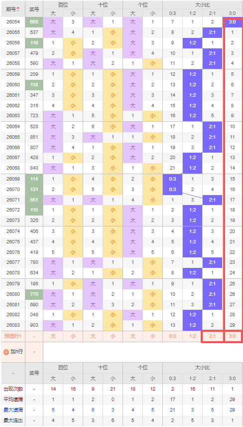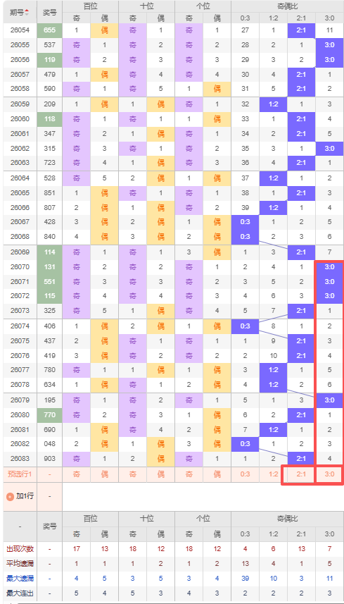 上期奇偶比:2:1,近10期奇偶比出现情况:0:3、2:1、2:1、1:2、1:2、3:0、2:1、1:2、0:3、2:1,最近10期出现4期2:1,出现3期1:2,出现2期0:3,出现1期3:0,根据近10期出号规律本期推荐连出2:1,防遗漏4期出3:0,综上所述奇偶比推荐:3:0,重点关注:2:1。