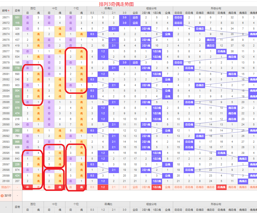 上一期的奇偶比为1:2,两偶的号码组合,从近五期的奇偶数出现情况看,奇数出4次,偶数出现11次,奇数号码出现较少,本期要侧重两偶的号码组合,侧重奇偶偶或奇奇偶的号码组合,根据奇偶组合形态可做五码定位13579/02468/02468或13579/13579/02468