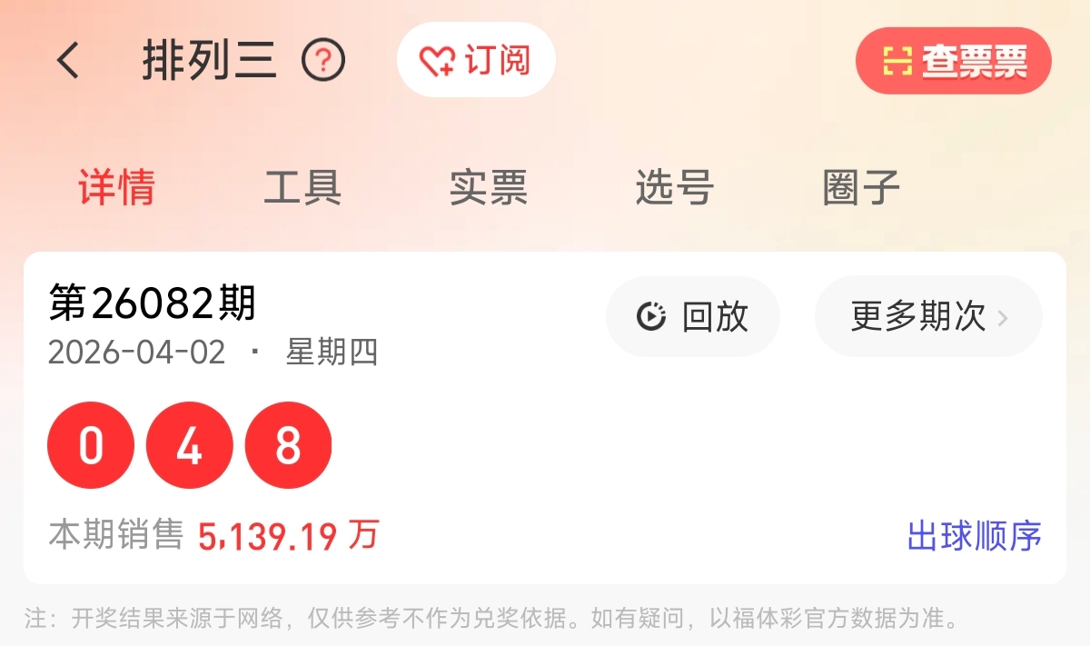 首先让我们回顾一下上期排列三第2026082期开奖号码为048,为组六形态,大小比为1:2,奇偶比为0:3,跨度为8,和值为12。