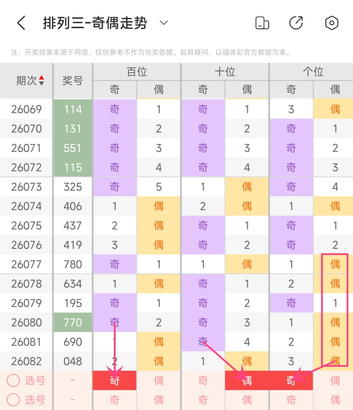 上期奇偶形态为偶偶偶,奇偶比为0:3,偶数占优形态,全偶组合。根据近期奇偶形态变化来看,近期奇偶形态变化频繁,上期奇偶形态开出全偶数组合较为极端,本期需注意奇数号码的反弹,预计本期奇偶比会回补奇数号码占优形态。预计本期奇偶形态可关注奇偶比2:1,奇数号码占优组合 。本期奇偶形态可重点关注:奇偶奇。
