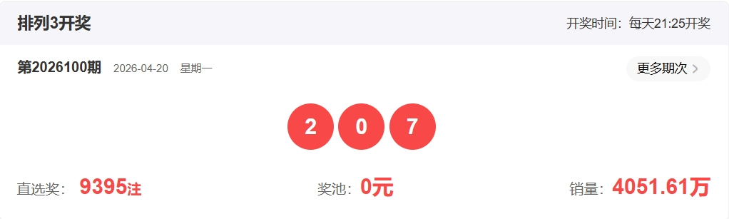 排列三第2026100期开奖回顾:开奖号码:207 形态:组六