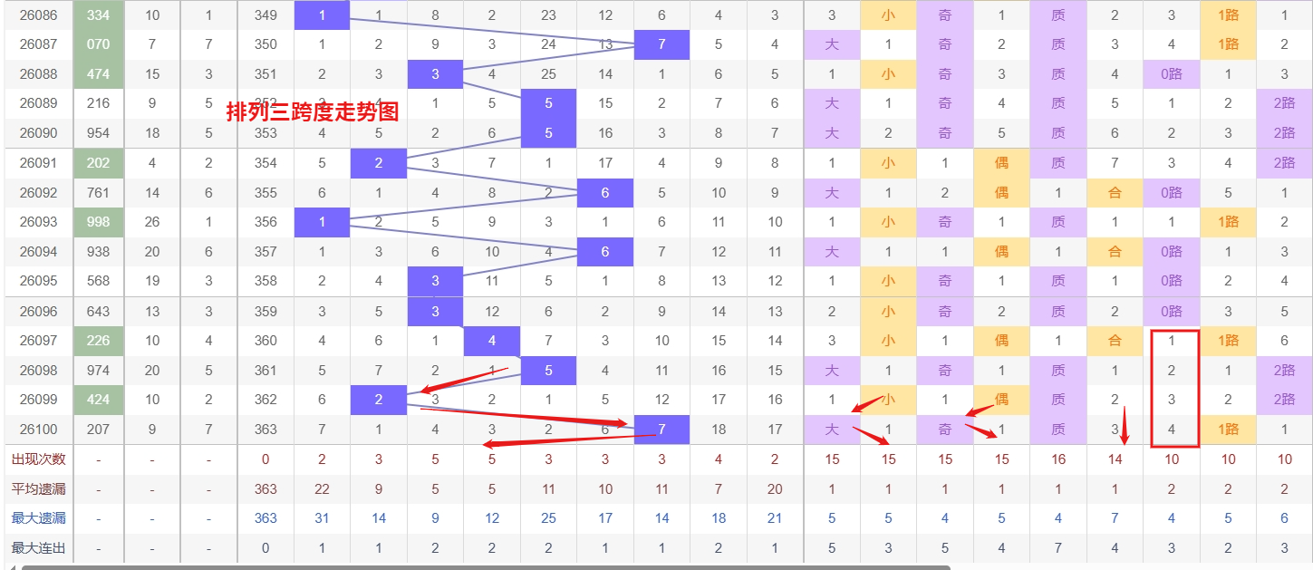 排列三 跨度分析:从上图可以看出近100期的跨度大小比约为48比52,跨度奇偶比约为45比55总体来看还是比较均衡的,但跨度大小之间有点差异。我们再从历史开出7跨后下一期3跨度数据来做参考。最近10期跨度大小比约为5:5期开出小数跨度过多返回大数跨度的概率更高一点。历史开奖近2期出7跨以后的走势为018期开出7跨后下一期走3跨走出4振幅,第022期开出7跨后下一期走8跨走1振幅第036期开出7跨后下一期开出5跨走出2振幅。连续多期小振幅,近期排列三跨度走势中,3跨和8跨呈现出明显的热号特征,两者在最近十到十五期内交替或连续出现的频率显著高于其他跨度值,从跨度运行的惯性规律来看,一旦某个或某几个跨度进入热态周期,往往不会在短期内迅速转冷,而是会以间歇性连下或密集回补的方式延续热度。具体来看,3跨作为中低区跨度,与顺子、半顺形态的关联度较高,当组选三或组选六中出现连号结构时,3跨的爆发概率会同步提升;而8跨作为高区跨度,通常对应着首尾差距较大的号码组合,8跨具备较强的持续开出能力。跨度走出1到4个振幅看好的跨度有3458跨,所以第2026101期排列三跨度推荐3458跨。本文由钱是生命动力所著,请勿转载