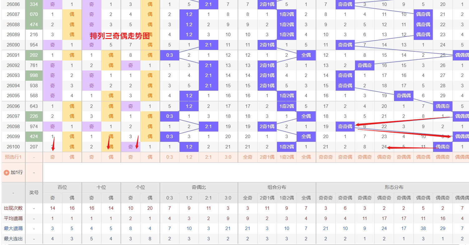 排列三 奇偶分析:从上图可以看出排列三100期内百位奇偶比约为52比48,十位奇偶比为51比49,个位奇偶比为54比46,十位的比值比较均衡,但是个位的比值偏差就有点大,历史奇偶形态近2期开出偶偶奇后下一期的走势为,第002期开出偶偶奇后003期开奇偶偶, 第015期开出偶偶奇后第016期开偶奇奇,第033期开出偶偶奇后第034期开奇偶奇,近期排列三奇偶走势中,偶奇奇和奇偶偶两种形态已持续遗漏较长时间,形成了明显的冷号堆积,从奇偶形态的长期轮动规律来看,任何冷态组合在超出平均遗漏周期后,都会面临越来越大的回补压力,尤其是当整体奇偶分布不再被单一的全奇或全偶形态主导,而是进入混合形态交替震荡的阶段时,冷态组合的补位概率会显著提升。具体而言,偶奇奇对应百位偶数、十位奇数、个位奇数的结构,这种组合在近期奇数整体偏活跃的背景下反而被长期忽略,一旦偶数在百位获得突破口,而十位和个位的奇数热度尚未完全消退,所以排列三2026101期奇偶形态推偶奇奇与奇偶偶。本文由钱是生命动力所著,请勿转载