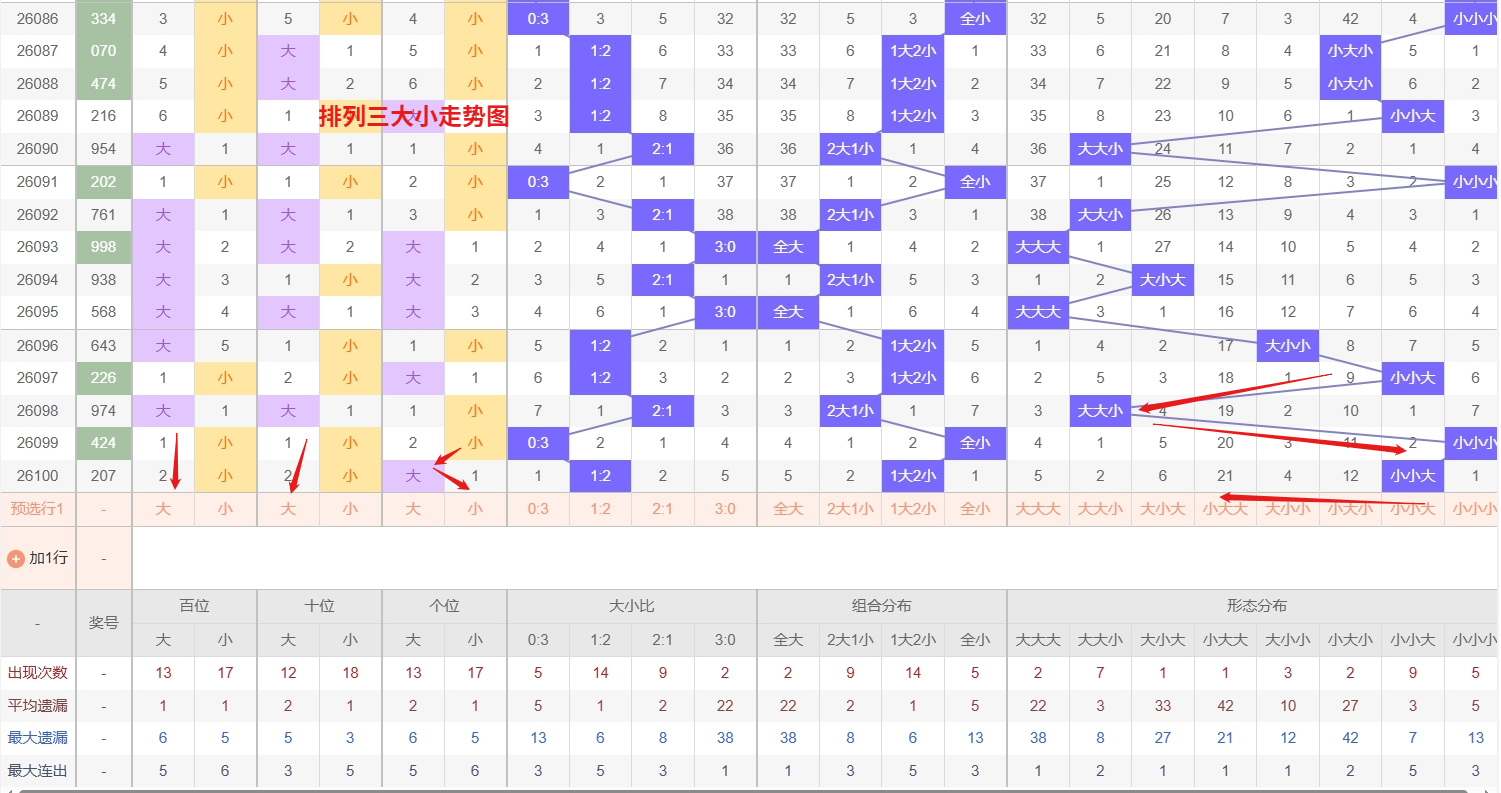 排列三 大小形态分析:从大小走势图上可以看出排列三100期内百位大小比约为47比53,十位大小比约为46:54,个位大小比约为55比45,除了个位奇数比偶数多,十位和百位偶数比奇数多。历史数据近2期开出小小大下一期的走势为,第007期开小小大后第008期开大小大。第012期开出小小大后第013期开大小小,第036期开出小小大后037期开小大大。近期排列三大小走势中,大小大形态已持续遗漏较长时间,形成明显的冷号积累,从大小形态的轮动规律来看,极端冷态往往伴随着一次技术性回补,尤其是当整体大小分布不再由全大或全小主导,而是进入大小交替震荡的阶段,大小大作为典型的两端大、中间小结构,在百位和个位大号回暖、十位小号保持活跃的背景下,触发回补的概率正在逐步上升。与此同时,大小小形态作为当前的中温组合,既未像大小大那样长期缺失,也没有出现过热透支的迹象,所以排列三第2026101期大小形态推荐大小大防大小小。本文由钱是生命动力所著,请勿转载