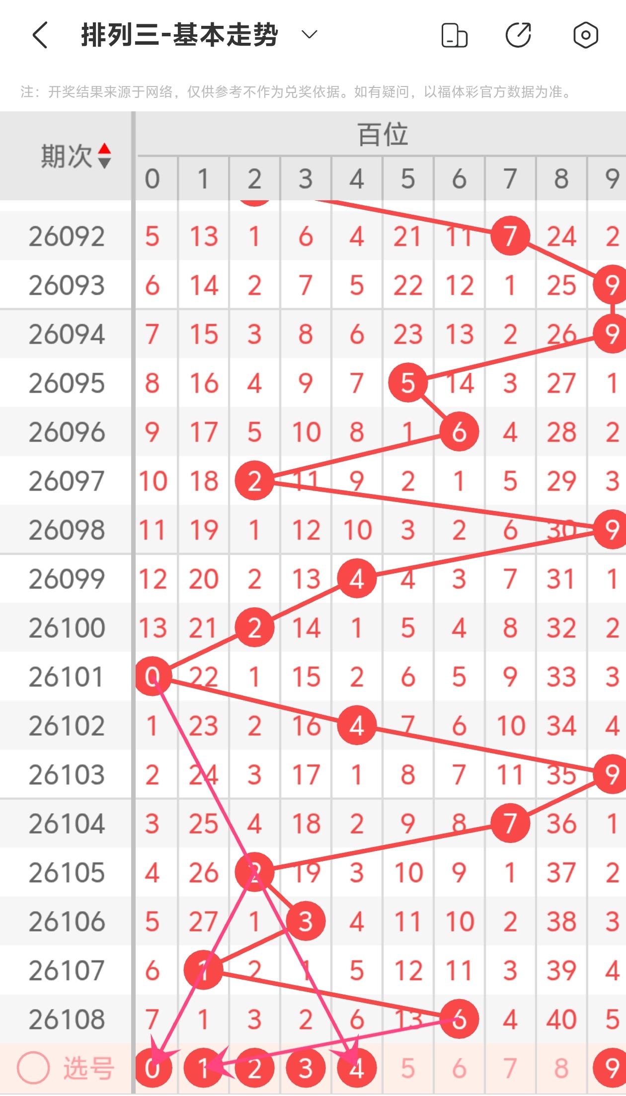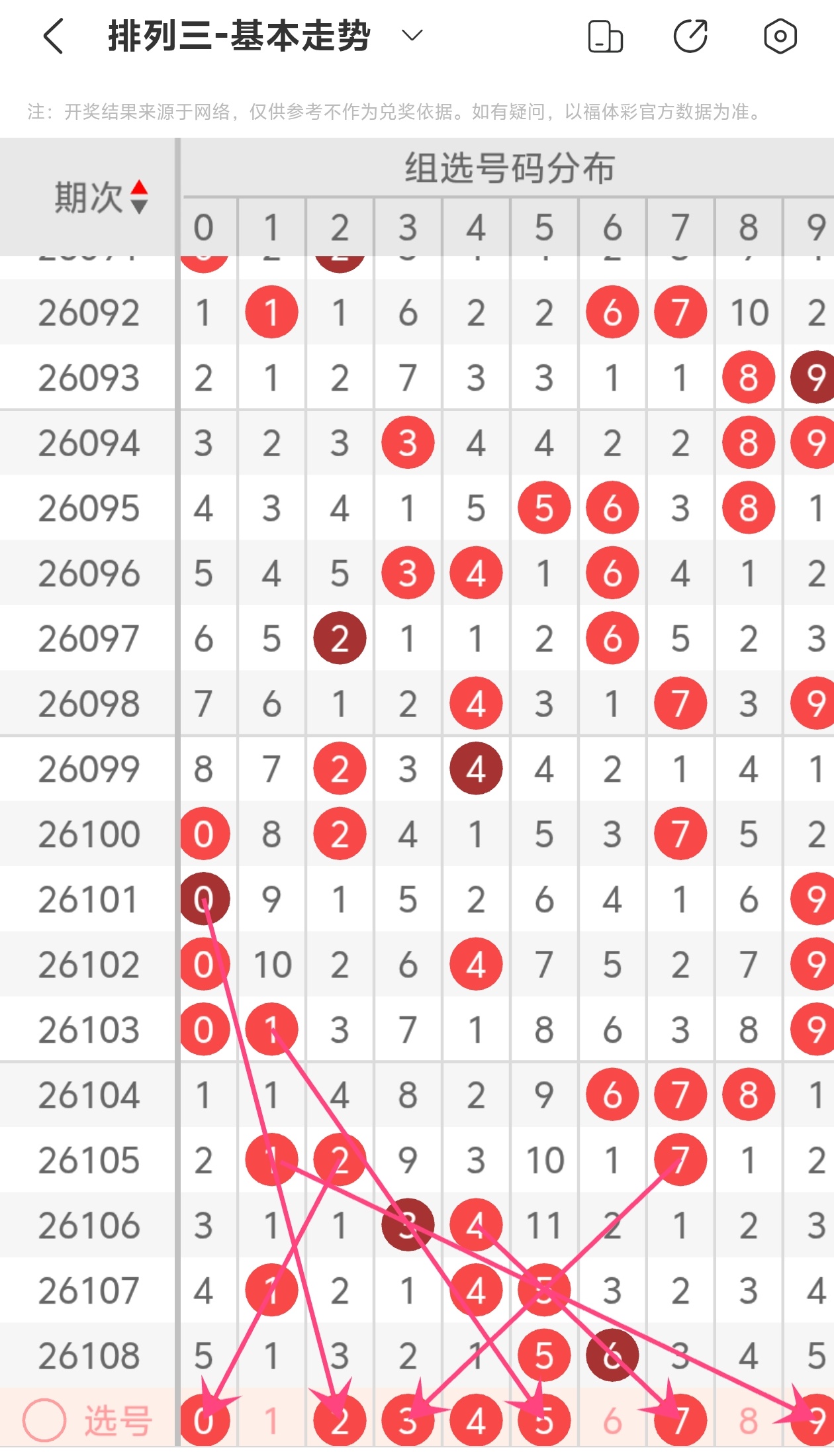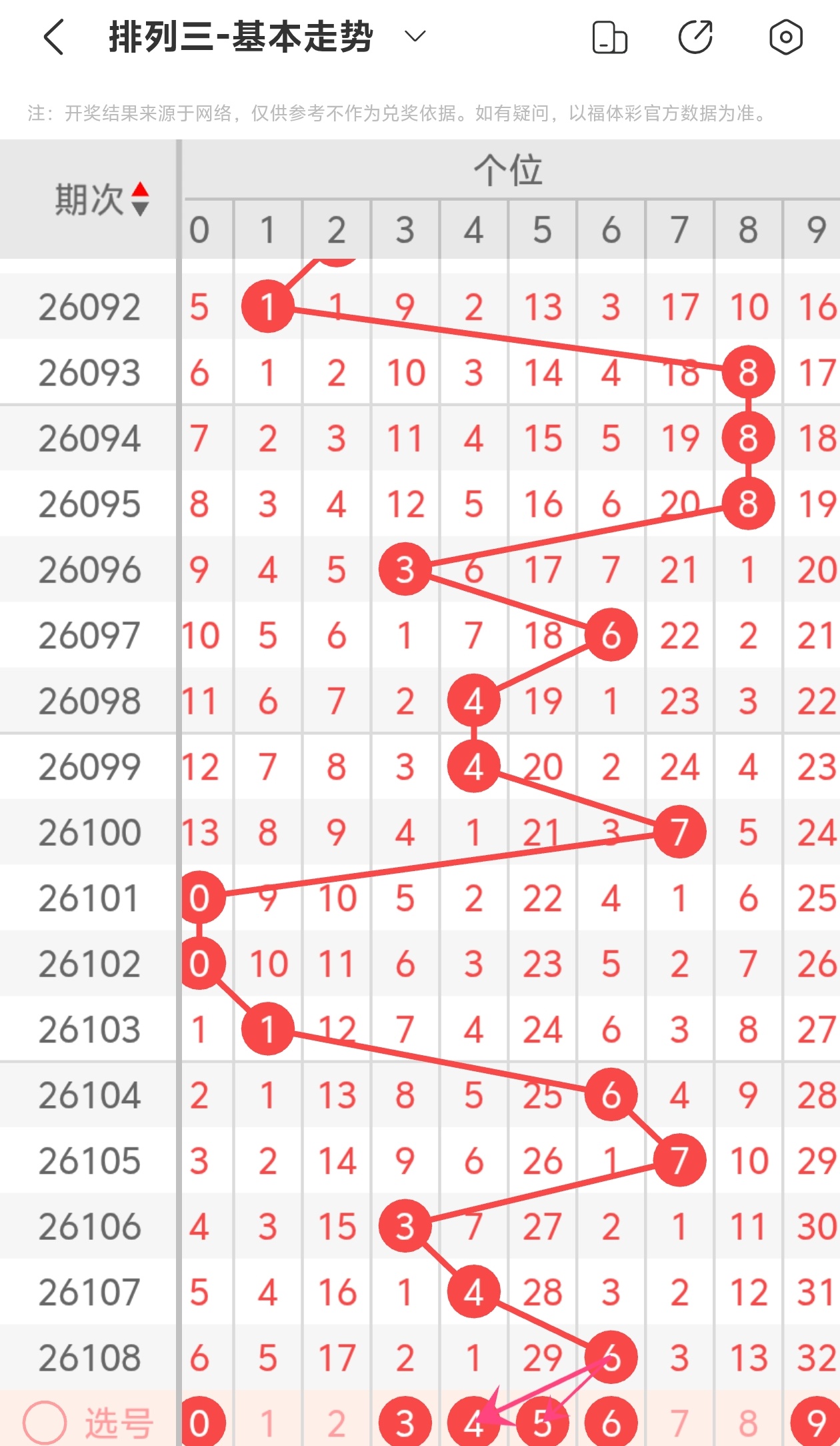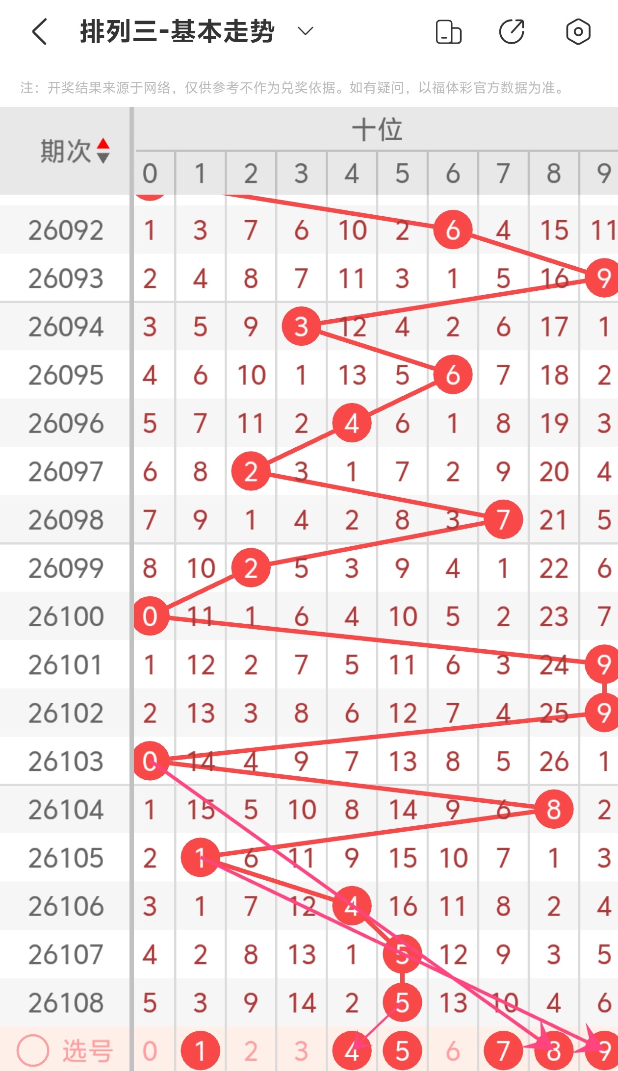 本期我们可以从上面走势图中看出选号的思路,上期个位6(偶数),近10期个位偶数开出7次,但偶数连续3期以上出现仅2次(2026095-097、104-106期),本期偶数大概率中断 。
