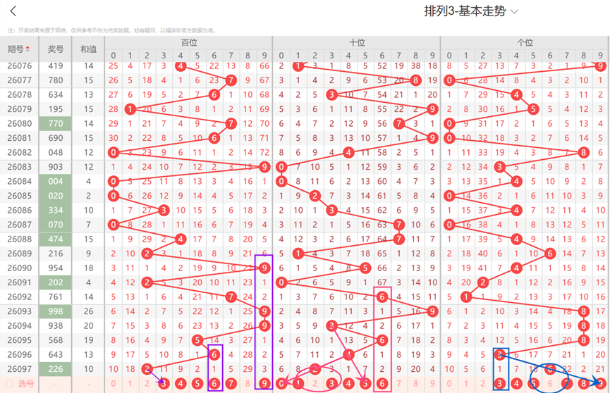 上一期百位开出号码为2,为偶数、小数、质数、2路号码:近10期百位08等号码遗漏值高,出号机会较少,本期百位开出08等号码的可能性小,因此本期百位选号时应该避免选择08等号码,结合上述走势图看,本期百位看好345679等号码。