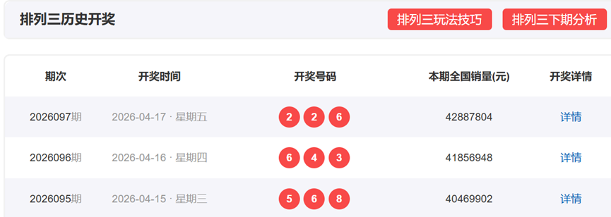 体彩排列3上一期,开奖号码为226,形态为组三,奇偶比为0:3,012路数值表现为220,和值10,和尾0,跨度4。