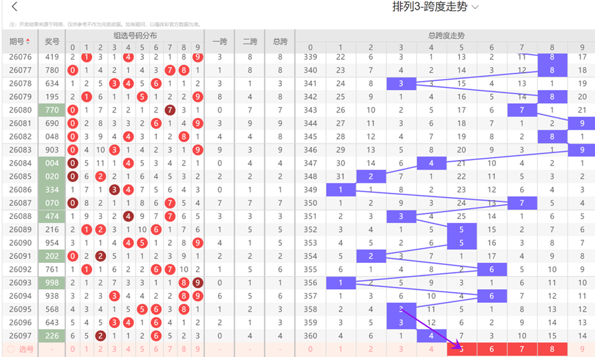 通过观察跨度及跨度属性走势可以发现:近10期内跨度开出的号码主要集中在3到8之间,本期跨度仍可能会在此区间出号,即本期跨度仍然应该考虑3到8之间的号码,再结合上述走势图看,本期跨度看好5678等号码。
