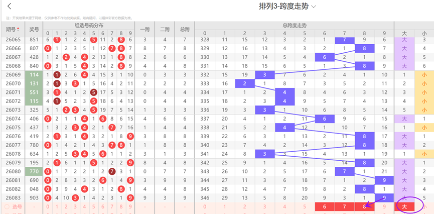 通过观察跨度及跨度属性走势可以发现:近10期内跨度大数号码出号数量多于小数号码,可见近期跨度更容易开出大数号码,因此本期跨度选号时应该继续考虑大数号码,再结合上述走势图看,本期跨度看好678等号码。