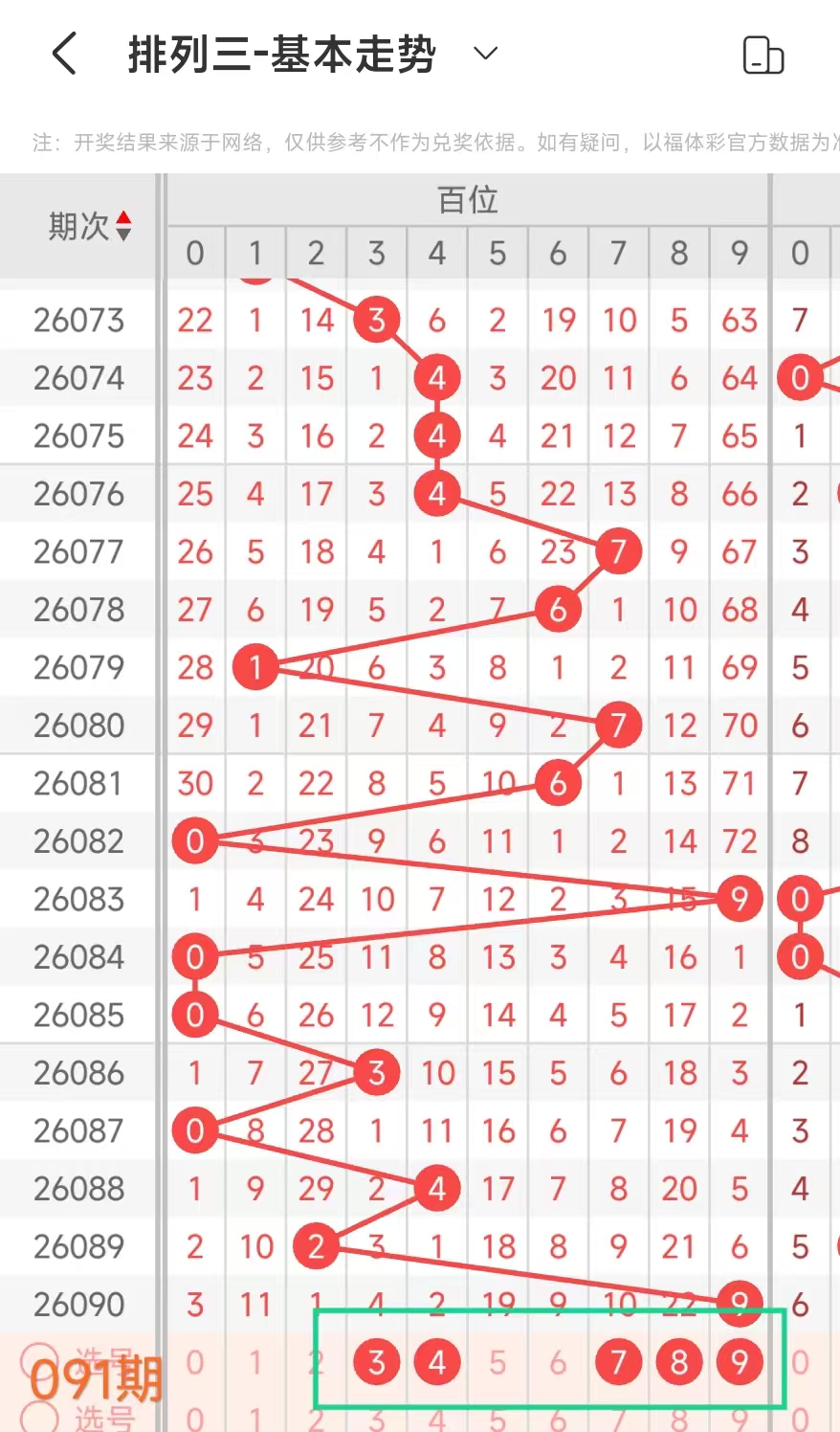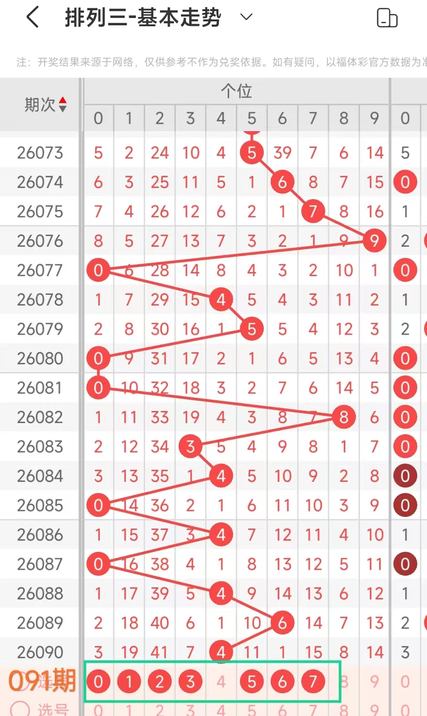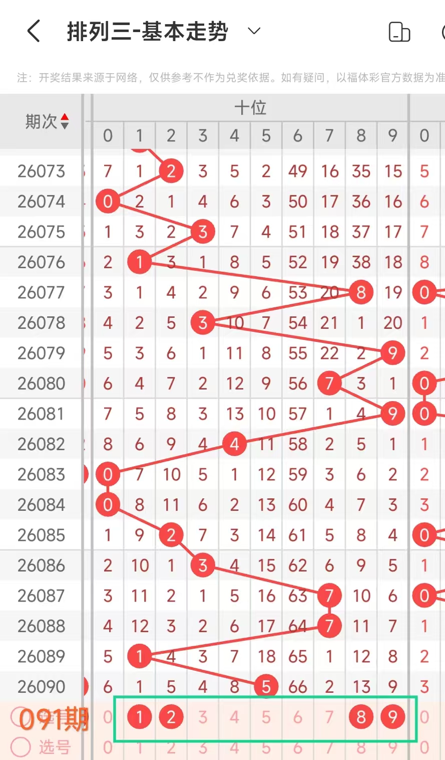 经统计0号出现9次、1号出现6次、2号出现5次、3号出现5次、4号出现3次、5号出6次、6号出现5次、7号出7次、8号出现3次、9号出现6次.统计后出现次数靠前的数字作为我们的备选号码.其号码有01579等
