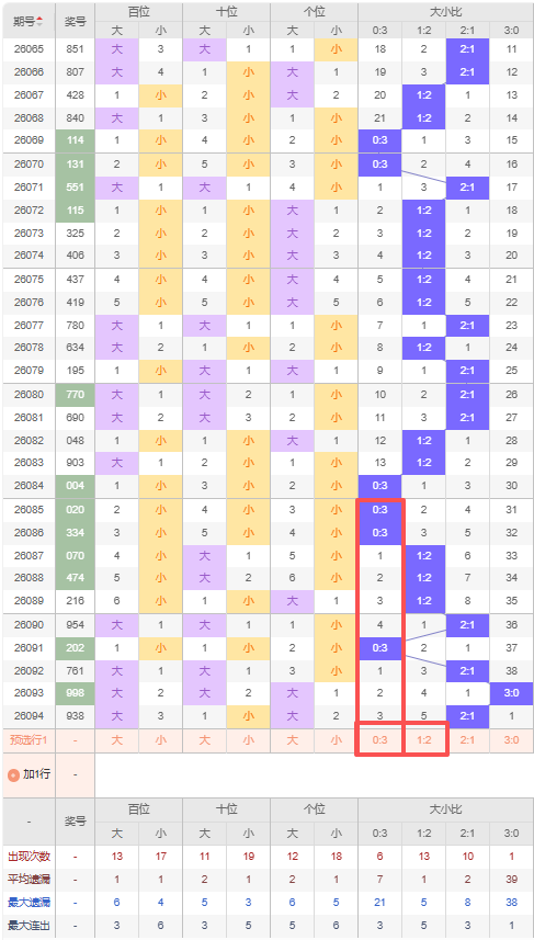 上期大小比:2:1,近10期大小比出现情况:0:3、0:3、1:2、1:2、1:2、2:1、0:3、2:1、3:0、2:1,最近10期出3期2:1,出现3期1:2,出现3期0:3,出现1期3:0,根据近10期出号规律本期推荐遗漏5期的1:2,防遗漏3期出0:3,综上所述大小比推荐:0:3,重点关注:1:2。
