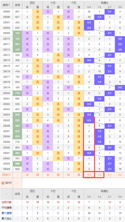 上期奇偶比:2:1,近10期奇偶比出现情况:0:3、2:1、1:2、1:2、1:2、2:1、0:3、2:1、2:1、2:1,最近10期出现5期2:1,出现3期1:2,出现2期0:3,出现0期3:0,根据近10期出号规律本期推荐遗漏5期出1:2,防遗漏3期出0:3,综上所述奇偶比推荐:2:1,重点关注:1:2。