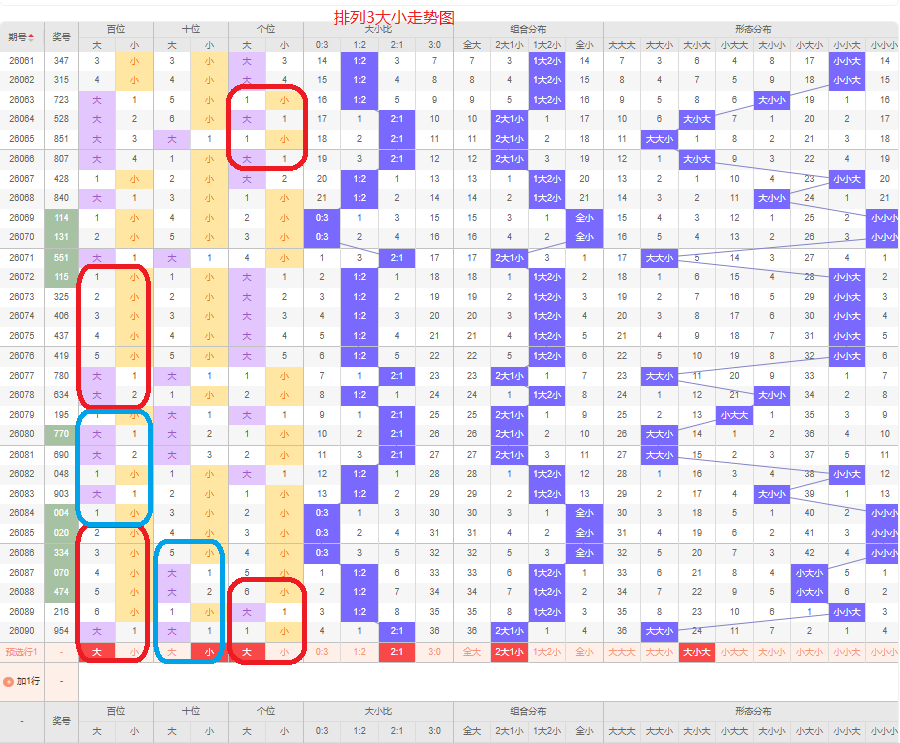 上一期大小比为2:1,两大的号码组合,近五期大号出5次,小号出10次,大号码出现较少,上一期是两大的号码组合,本期侧重两大的号码组合,百位侧重大号码,十位侧重小号码,个位侧重大号码,侧重大小大或者小小大的号码组合,根据大小形态五码定位56789/01234/56789或者01234/01234/56789