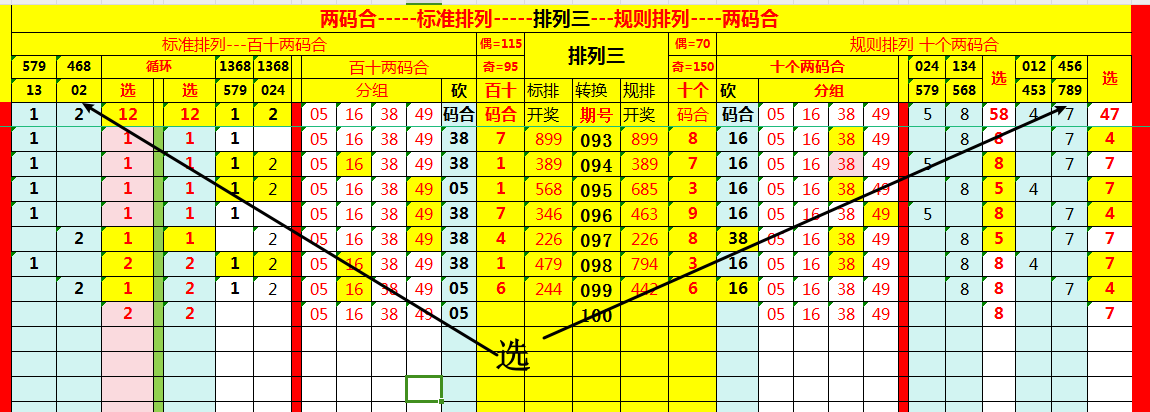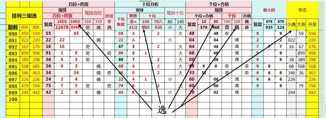 思路技巧2:规则排列中,根据“十位”数字奇偶律,大小律特征,与标准排列的十位数字并集分析,其中十位数字相同的150注,不相同的70注,这一特点具有实用价值。