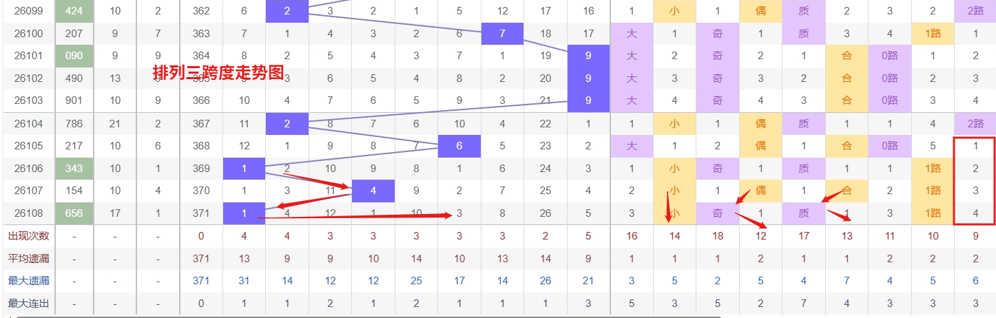 排列三 跨度分析:从上图可以看出近100期的跨度大小比约为53比47,跨度奇偶比约为49比51总体来看还是比较均衡的,但跨度大小之间有点差异。我们再从历史开出1跨后下一期5跨度数据来做参考。最近10期跨度大小比约为6:4期开出大数跨度过多返回小数跨度的概率更高一点。历史开奖近2期出1跨以后的走势为017期开出1跨后下一期走3跨走出2振幅,第036期开出1跨后下一期走5跨走4振幅第055期开出1跨后下一期开出4跨走出3振幅。连续多期大振幅,排列三跨度走势中,近期8跨作为明显的冷态需要重点盯防。从历史出号节奏看,8跨在遗漏多期后已进入理论回补窗口,尤其是近期偶跨度整体热出,同为偶数的8跨存在借势回补的可能,关注其由冷转温的过渡信号。与此同时,5跨作为典型的温号区间,近期出现频率虽不算密集,但各项指标正逐步回暖——无论是相邻跨度传导还是奇偶轮动规律,都暗示5跨有从温态向热态迈进的迹象,近5期内开出的概率正在提升。跨度走出2到5个振幅看好的跨度有3578跨,所以第2026109期排列三跨度推荐3578跨。本文由钱是生命动力所著,请勿转载