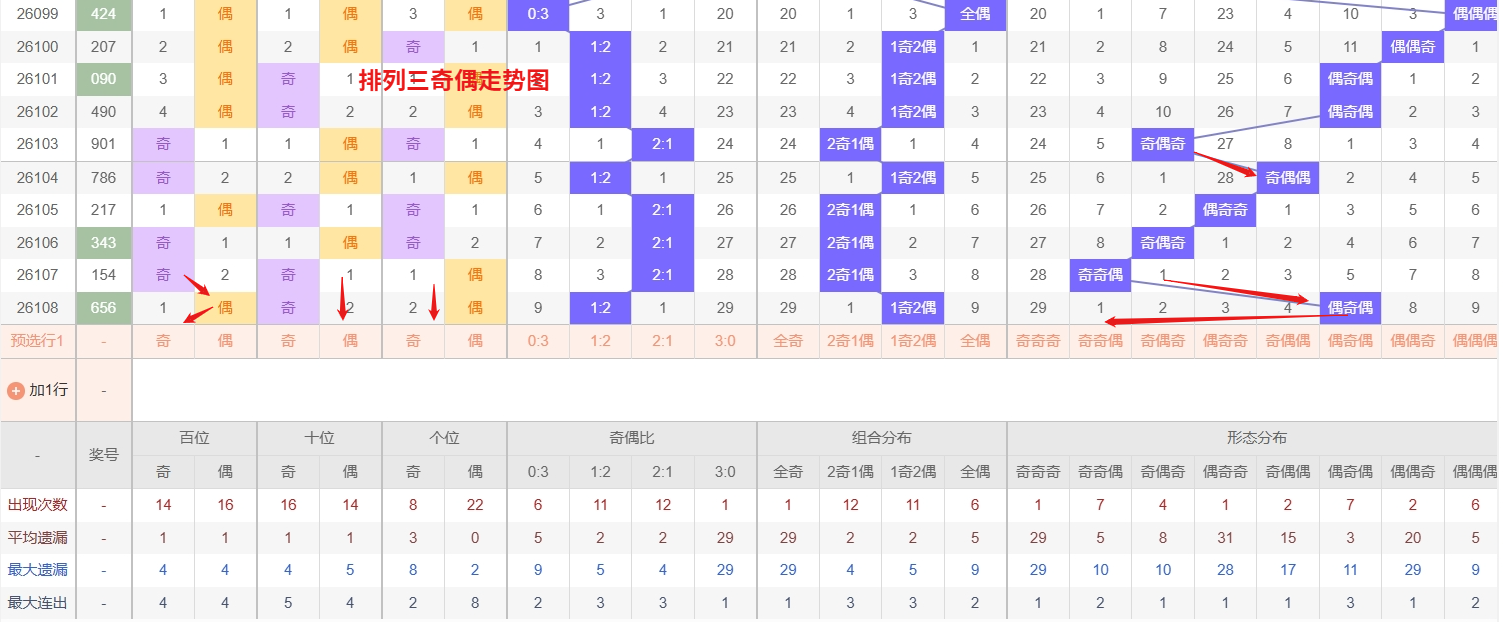 排列三 奇偶分析:从上图可以看出排列三100期内百位奇偶比约为46比54,十位奇偶比为51比49,个位奇偶比为53比47,十位的比值比较均衡,但是百位的比值偏差就有点大,历史奇偶形态近2期开出偶奇偶后下一期的走势为,第014期开出偶奇偶后015期开奇奇奇, 第027期开出偶奇偶后第028期开奇偶偶,第038期开出偶奇偶后第039期开偶偶奇,排列三奇偶走势中,近期奇奇奇和奇偶偶这两种形态均已进入冷态区间,从历史出号规律来看,两者都存在较强的回补可能。其中,奇奇奇作为全奇组合,在连续多期未现身后,其遗漏值已接近甚至超过常态回补周期,所以排列三2026109期奇偶形态推奇奇奇与奇偶偶。本文由钱是生命动力所著,请勿转载