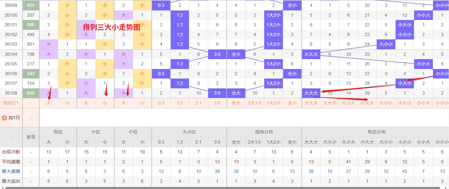 排列三 大小形态分析:从大小走势图上可以看出排列三100期内百位大小比约为52比48,十位大小比约为49:51,个位大小比约为53比47,除了个位和百位奇数比偶数多,十位偶数比奇数多。历史数据近2期开出大大大下一期的走势为,第005期开大大大后第006期开大小大。第014期开出大大大后第015期开小小大,第037期开出大大大后038期开小大大。近期排列三大小走势中,大小大与小大大这两种形态已形成明显的冷号格局,其间隔周期显著超出平均回补范围,从历史出号规律及冷热交替原理来看,长时间未出现的形态往往面临概率回归的压力,尤其当其他大小组合动时,这两个冷态组合的遗漏值已积累至临界区域,近期存在较强的回补预期,所以排列三第2026109期大小形态推荐大小大防小大大。本文由钱是生命动力所著,请勿转载