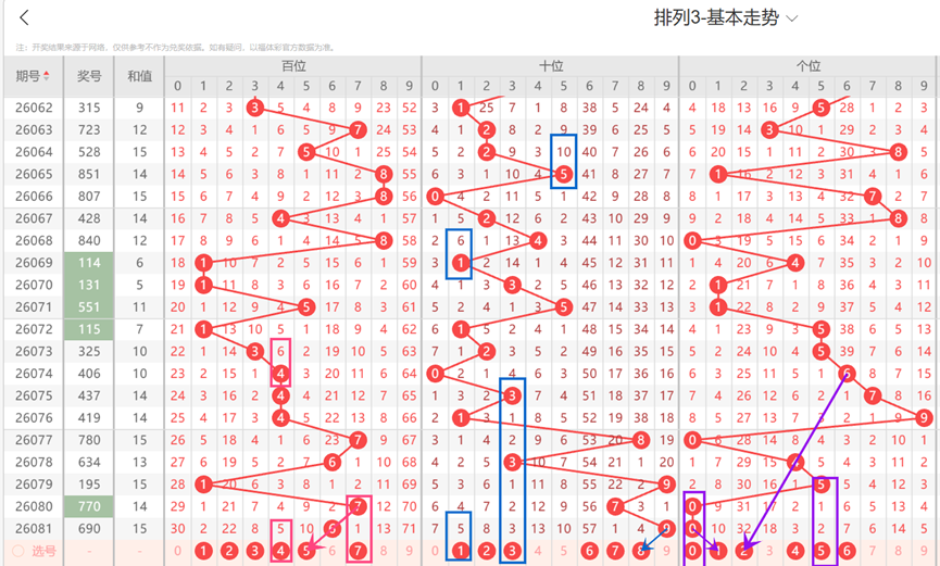 上一期百位开出号码为6,为偶数、大数、合数、0路号码:近10期百位09等号码较少出号,本期百位开出09等号码的可能性小,本期百位选号时应该考虑09以外的号码,结合上述走势图看,本期百位看好123457等号码。