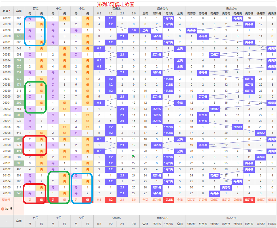 上一期的奇偶比为2:1,两奇的号码组合,从近五期的奇偶数出现情况看,奇数出8次,偶数出现7次,奇数偶数号码出现较平均,本期要侧重两偶的号码组合,侧重偶奇偶或偶奇奇的号码组合,根据奇偶组合形态可做五码定位02468/13579/02468或02468/13579/13579