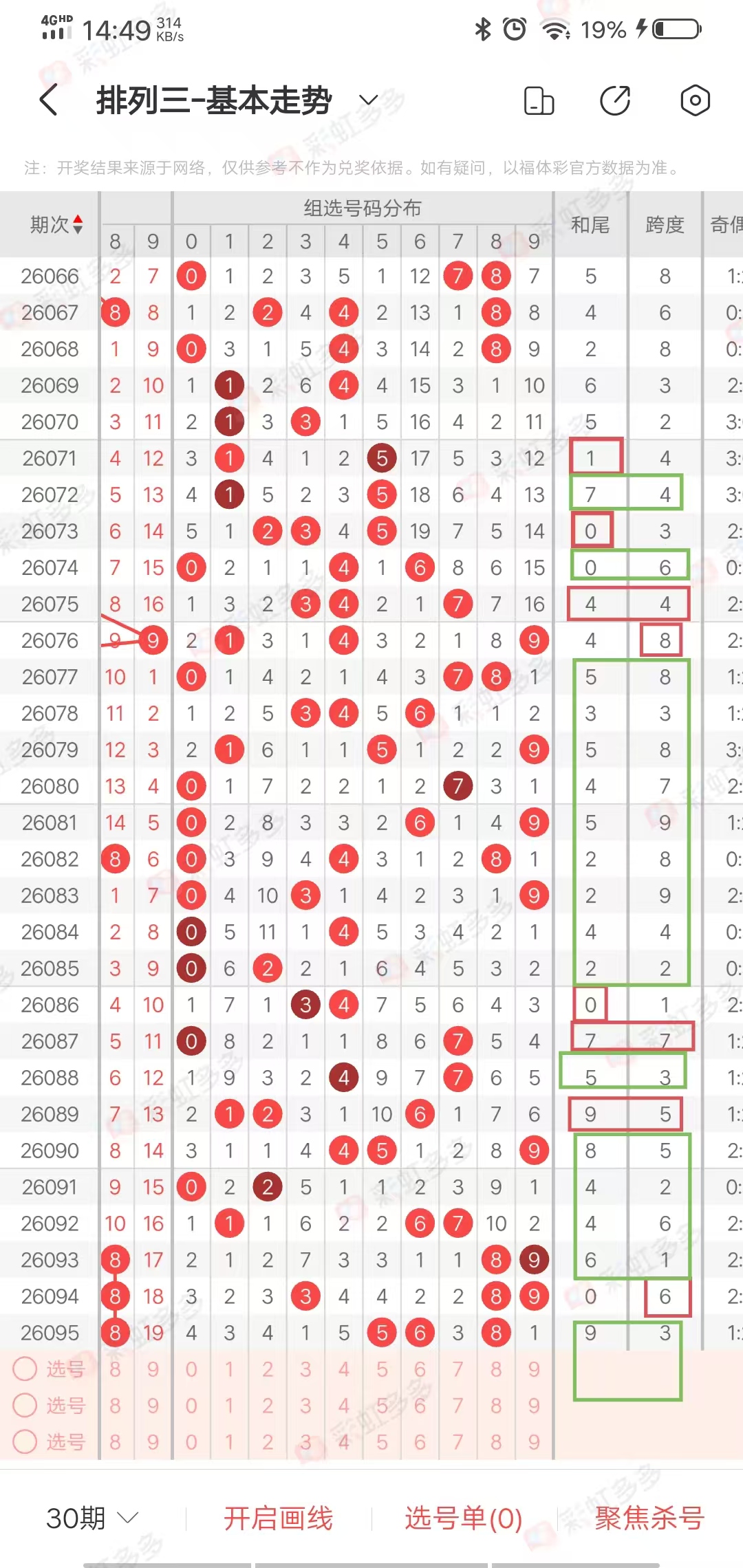 从走势图可以看出,近期跨度幅度-1➕2-1➕1-5-2-1➕6-4➕2➕0-3➕4-5➕5-3,幅度在上下5左右,近12期多走上下走势,上期下降,本期有上升走势,综合跨度453