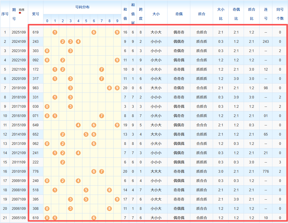 1、统计往年同期开奖号码