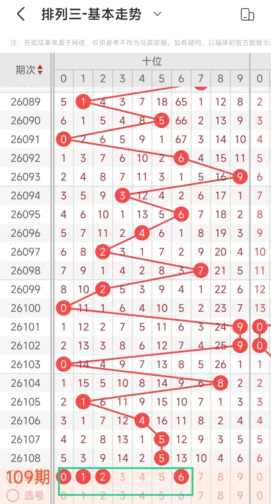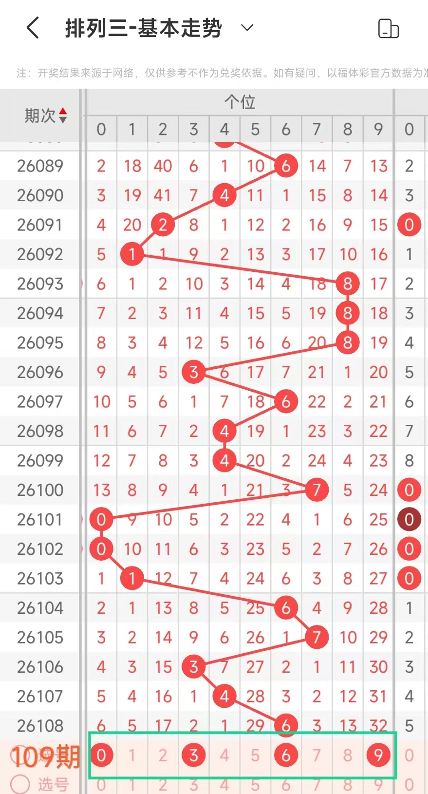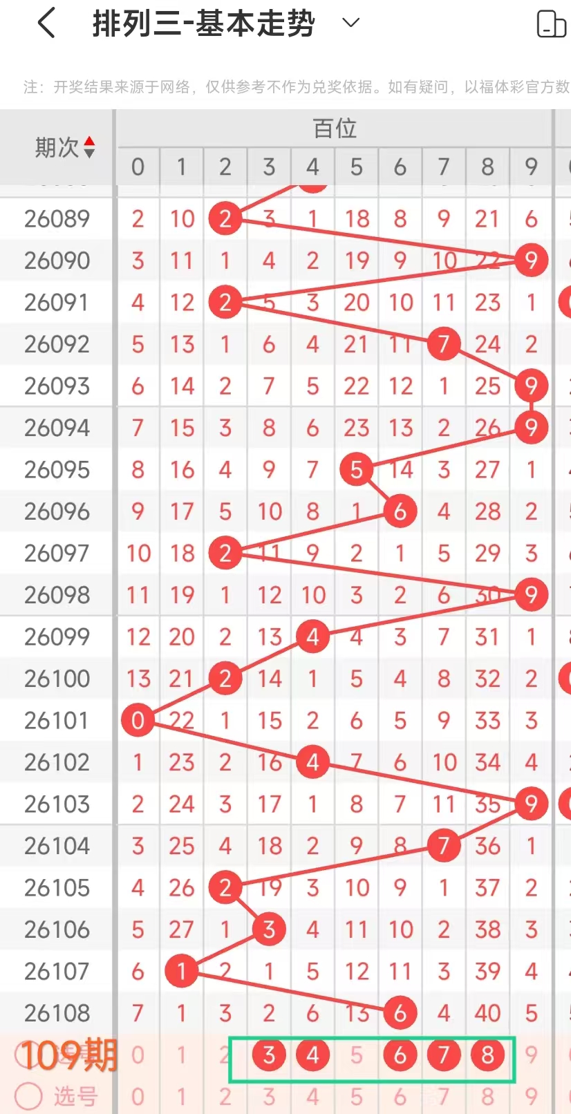 经统计0号出现8次、1号出现8次、2号出现8次、3号出现8次、4号出现4次、5号出3次、6号出现6次、7号出4次、8号出现3次、9号出现5次.统计后出现次数靠前的数字作为我们的备选号码.其号码有0123等