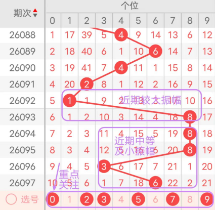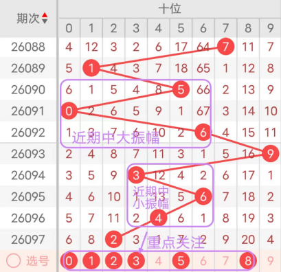 近7期(091~097)开奖号十位号码球分别为0、6、9、3、6、4、2,开奖号与上一期走出的振幅分别为5、6、3、6、3、2、2。091期走出0号小数号码球,走出“5”的中大幅度,092期走出6号中大数号码球,走出“6”的中大幅度,093期走出9号大数号码球,走出“3”的中小幅度,094期走出3号中小数号码球,走出“6”的中大幅度,095期走出6号中大数号码球,走出“3”的中小幅度,096期走出4号中小数号码球,走出“2”的小幅度,097期走出2号小数号码球,走出“2”的小幅度;从振幅大小及走势图的整体对应来看,中大振幅走在3~6之间较为适宜,中小振幅走在0~2之间较为适宜;结合走势图的上下对应及振幅大小分析,本期十位应重点关注号码球为0、1、2、3、5、8。