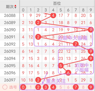 近7期(091~097)开奖号百位号码球分别为2、7、9、9、5、6、2,开奖号与上一期走出的振幅分别为7、5、2、0、4、1、4。091期走出2号小数号码球,走出“7”的大幅度,092期走出7号大数号码球,走出“5”的中大幅度,093期走出9号大数号码球,走出“2”的小幅度,094期走出9号大数号码球,走出“0”的小幅度,095期走出5号中大数号码球,走出“4”的中小幅度,096期走出6号中大数号码球,走出“1”的小幅度,097期走出9号大数号码球,走出“7”的大幅度;从振幅大小及走势图的整体形势来看,中大幅度走在5~7之间较为适宜,中小幅度走在0~2之间较为适宜;结合走势图的整体及大小走势分析,本期百位需重点关注号码球为0、2、3、4、7、9。