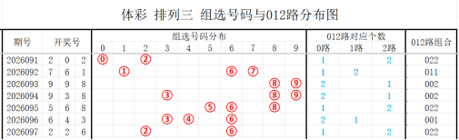 012路定义:0路为0369,1路为147,2路为258。请看开奖号对应012路分布图: