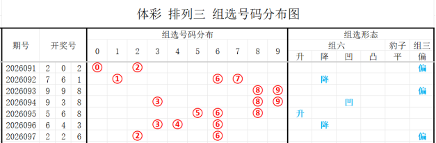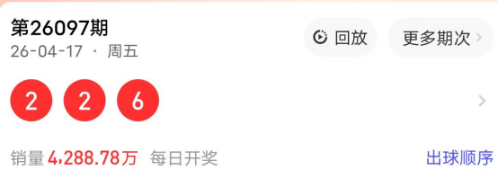 2026097期开奖号码为226,奇偶值为3偶;大小值为1大2小;012路走势为022路;跨度为4跨;和值10点;组三形态。