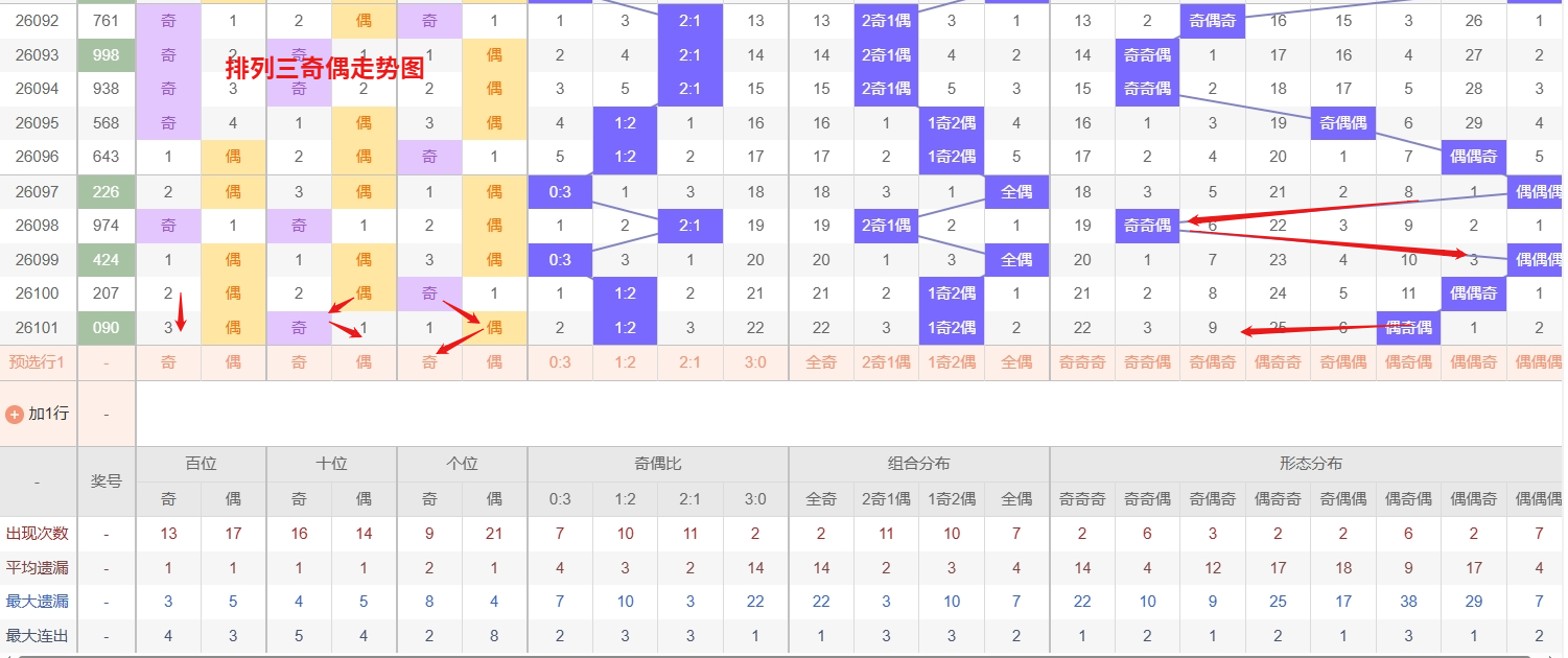 排列三 奇偶分析:从上图可以看出排列三100期内百位奇偶比约为45比55,十位奇偶比为53比47,个位奇偶比为51比49,个位的比值比较均衡,但是百位的比值偏差就有点大,历史奇偶形态近2期开出偶奇偶后下一期的走势为,第008期开出偶奇偶后009期开奇奇奇, 第012期开出偶奇偶后第013期开奇奇偶,第036期开出偶奇偶后第037期开奇偶奇,从近期排列三奇偶走势来看,奇奇偶作为一种典型的偏态组合,出现频率明显高于均值,且当前正处于密集回补的活跃阶段,形态连续性较强,具备明确的连下基础,尤其在近期奇数在百位和十位保持强势、个位偶数列队跟进,奇奇偶很容易被重复打出,因此未来一两期仍应优先关注其直接落位。与此同时,奇奇奇则处于明显的冷号状态,遗漏值已拉长至常态周期之外,从奇偶形态的历史轮动规律来看,当某种偏奇组合如奇奇偶持续走热时,往往意味着全奇形态已在积蓄回补,所以排列三2026102期奇偶形态推奇奇偶与奇奇奇。