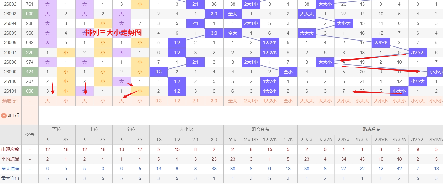 排列三 大小形态分析:从大小走势图上可以看出排列三100期内百位大小比约为52比48,十位大小比约为49:51,个位大小比约为54比46,除了个位和百位奇数比偶数多,十位偶数比奇数多。历史数据近2期开出小大小下一期的走势为,第003期开小大小后第004期开大大大。第018期开出小大小后第019期开大小大,第031期开出小大小后032期开小大大。从近期排列三大小走势来看,大大大和大小大均处于明显的冷号状态,两者遗漏值都已显著超出各自的平均出号周期,且近期全大或大数占优的组合出现频率偏低,形成了较为突出的回补缺口。从大小形态的规律分析,冷号往往不会无限期遗漏,当热度集中在小号或两小一大等反向形态连续出现后,大数组合的反弹需求会迅速累积,尤其大大大作为全大形态,一旦回补往往以连出或短周期密集出现的方式完成;所以排列三第2026102期大小形态推荐大小大防大大大。